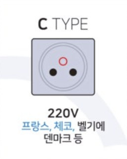F 형 | F형 콘센트(유럽형 콘센트)를 사용하는 나라는 독일, 프랑스, 스페인, 오스트리아, 네덜란드, 러시아, 튀르키예 등 유럽 대륙 대부분의 국가와 일부 아프리카 및 남미 국가들이 있습니다. 230V 전압에 주로 사용 |