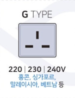 G형 | G형 콘센트를 사용하는 나라는 영국, 아일랜드, 몰타, 키프로스, 말레이시아, 싱가포르, 홍콩 등이 있습니다. 이 외에도 영국 연방 국가들에서 주로 사용됩니다. 유럽: 영국, 아일랜드, 몰타, 키프로스 아시아: 말레이시아, 싱가포르, 홍콩, 브루나이 등 아프리카: 보츠와나, 가나, 케냐, 나이지리아, 남아프리카 공화국, 탄자니아, 우간다 등 중동: 바레인, 이라크, 요르단, 카타르, 사우디 아라비아, 아랍에미리트 등 오세아니아: 키리바시, 솔로몬 제도, 투발루 등 |